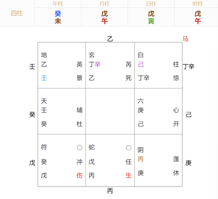 日干戊代表你,落坎宫。合干癸为另一半,落艮宫。婚姻六合落兑宫。今年丙午年,在离宫。