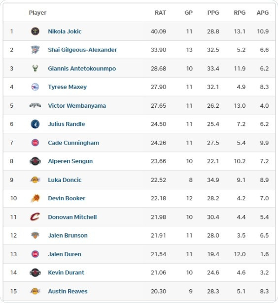 美媒HoopsHype使用GlobalRating根据球员在场上的影响力进行排名,通过结合个人和球队数据来衡量篮球运动员在全球范围内的表现。该评分系统不仅考虑了球员在场上的影响力,还纳入了缺席比赛的因素,详情如下: