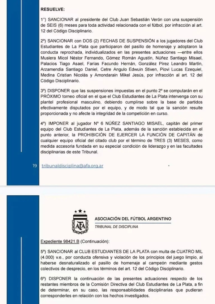 更荒诞还有,11月27日阿根廷足协对此开出严厉罚单:大学生俱乐部被罚款1.2亿阿根廷比索(约8.27万美元),主席贝隆被禁止足球活动6个月,队长努涅斯被禁止担任场上队长3个月;11名背向列队首发球员均被禁赛两场,不过禁赛从明年联赛开始时生效,球员若届时离开大学生队则无需被禁赛。