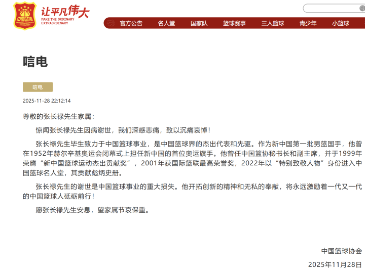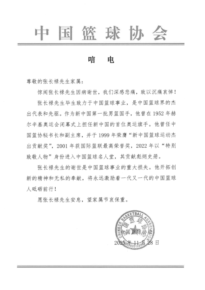 张长禄先生的谢世是中国篮球事业的重大损失。他开拓创新的精神和无私的奉献,将永远激励着一代又一代的中国篮球人砥砺前行!